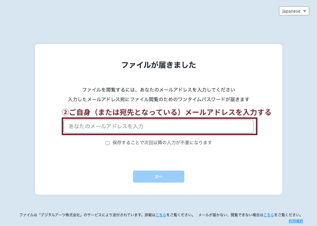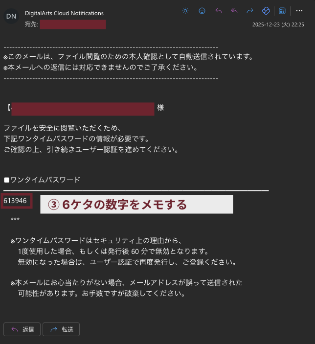 • 上記②で入力したメールアドレス宛に、「DigitalArts Cloud Notifications」という差出人から「ファイル閲覧用パスワードのお知らせ」という件名のメールが届きます