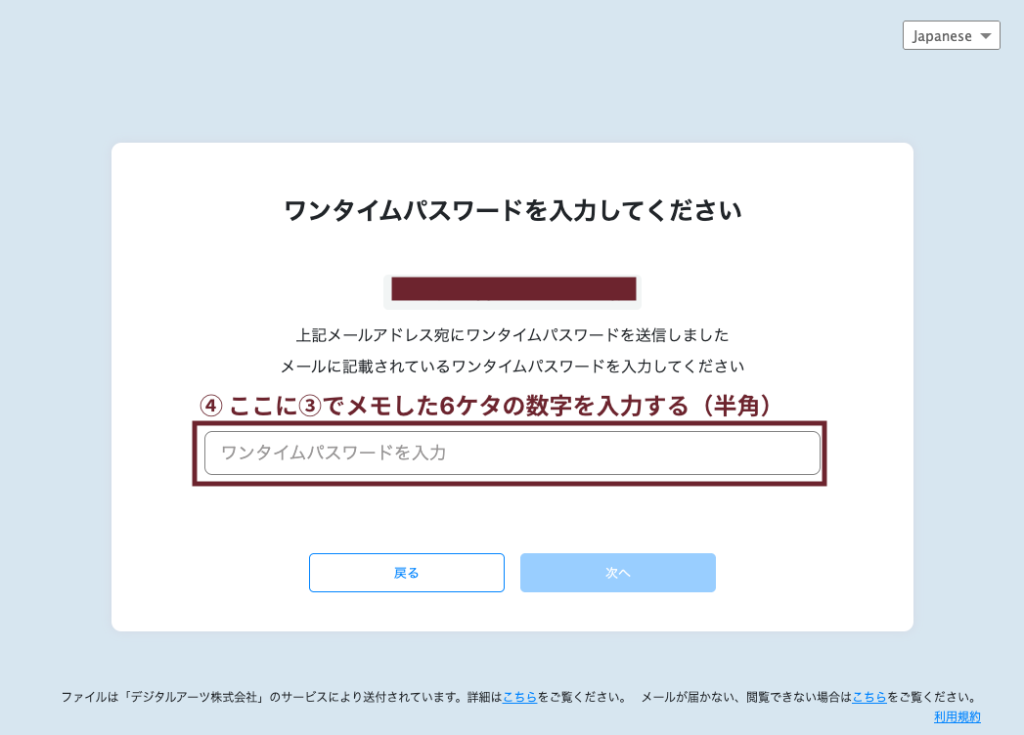 • ブラウザに戻り、③でメモした6ケタのワンタイムパスワードを半角数字で入力します